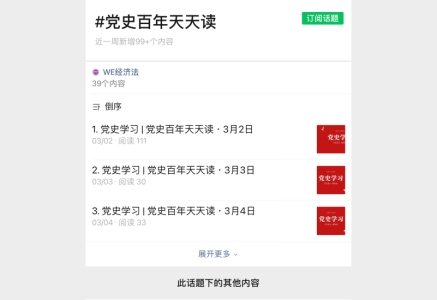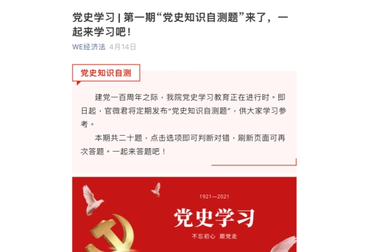 2021年3月2日起,学院公众号推出系列推送【党史学习|党史百年天天读】栏目,每天更新党史学习资料,截至目前已连续推出文章65篇。该栏目内容转自公众号共产党员,在“重要论述”“党史回眸”“历史瞬间”三大板块中图文并茂地分享了重要讲话精神、历史节点等多项内容。自4月14日学院公众号还推出了“党史知识自测题”,供全院师生学习参考,为迎接中国共产党百年华诞、回顾党的光辉历程创造了条件,营造出学党史、知党情、跟党走的浓厚氛围,进一步丰富党史学习教育内容,以实际行动践行初心使命。