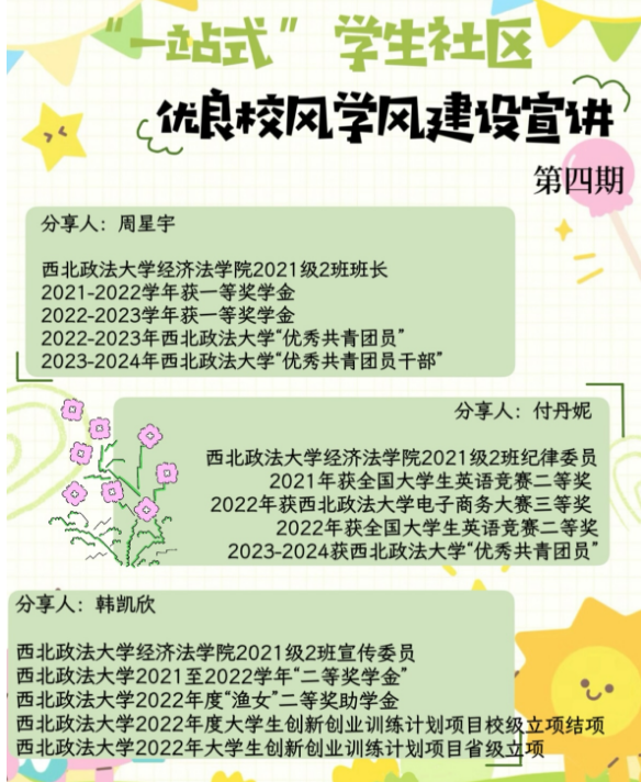 学风是读书之风,是治学之风,更是做人之风。优良的学风是激励大学生奋发向上、锐意进取、开拓创新的强大精神力量。6月5日中午,本科生第二党支部采取线下会议的方式组织开展第四期优良校风学风建设宣讲会。此次邀请2021-2022学年度、2022-2023学年度获一等奖学金、2023-2024年新葡的京集团35222vip“优秀共青团员干荣誉获得者2021级2班周星宇;2021年、2022年获全国大学生英语竞赛二等奖、2022年获新葡的京集团35222vip电子商务大赛三等奖获得者2021级2班付丹妮;2022年度大学生创新创业训练计划项目校级立项结项、省级立项、2022年度“渔女”二等奖助学金获得者2021级2班韩凯欣进行宣讲。