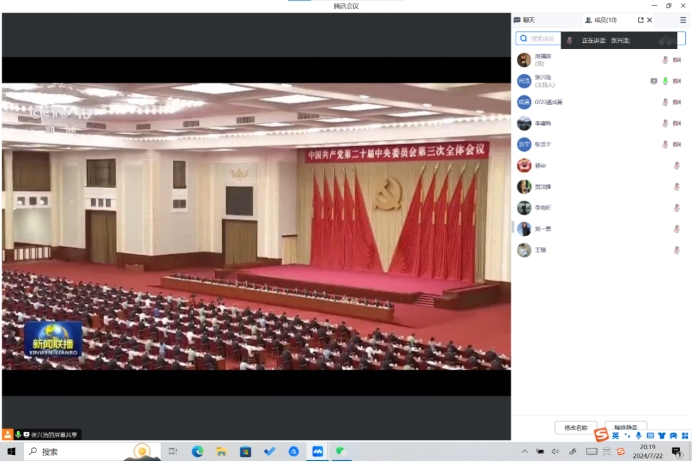 会议通过观看视频学习了《中国共产党第二十届中央委员会第三次全体会议公报》,张兴浩领学了中共中央举行的介绍和解读党的二十届三中全会精神新闻发布会与《中共中央关于进一步全面深化改革、推进中国式现代化的决定》等内容。