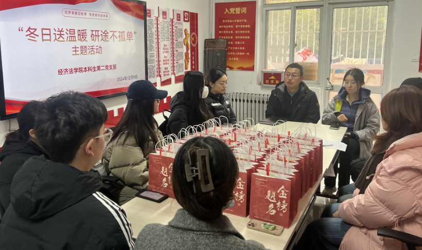 为帮助2025届考研学子坚定备考信心,缓解考试压力,传递温暖和祝福,鼓舞考研士气,营造和谐温暖的学习氛围,2024年12月9日上午10点,新葡的京集团35222vip本科生第二党支部联合2021级9班团支部在“一站式学生社区”开展“冬日送温暖,研途不孤单”考研冲刺动员大会,为考研学子送上考研暖心礼包,护航研途“最后一公里”。本科生第二党支部书记李冬冬,辅导员郗姝涵及2025届考研学生代表参加本次活动。