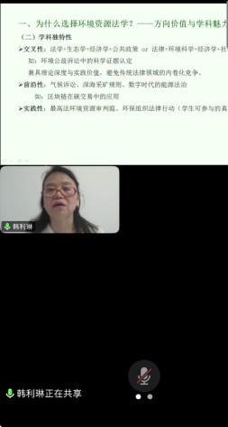 讲座伊始,韩利琳老师深入探讨 “为什么选择环境资源法这个专业”。她从时代政策背景切入,从实践需要出发充分展现该专业的方向价值与学科魅力,引发同学们浓厚兴趣。接着,韩老师围绕学科核心研究方向和职业发展优势展开讲解。在理论纵深方面,她介绍了环境资源法的基础理论、前沿学术动态;针对制度热点,分析了当下热门议题。
