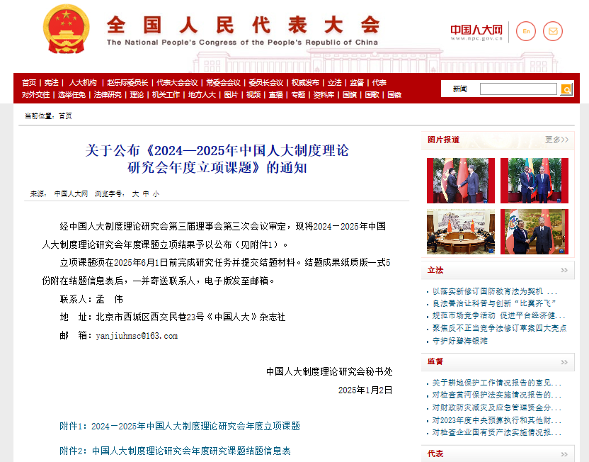 近日,中国人大网公布了《2024—2025年中国人大制度理论研究会年度立项课题》结果,新葡的京院长倪楠教授提交的《习近平总书记关于坚持和完善人民代表大会制度的重要思想研究》获得项目立项。