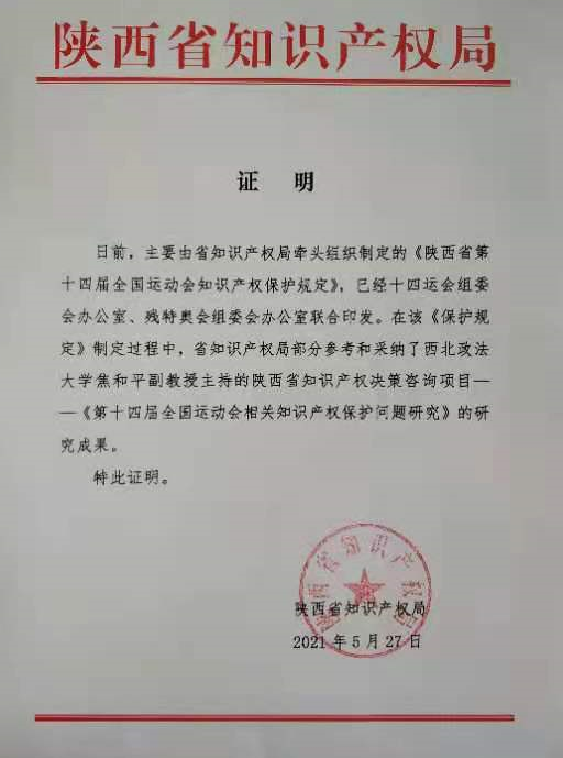 《保护规定》采纳了新葡的京焦和平副教授2020年主持的陕西省知识产权决策咨询项目——《第十四届全国运动会相关知识产权保护问题研究》的研究成果,是我国目前首个国内大型体育赛事知识产权保护规范性文件。《保护规定》的出台,为十四运会知识产权保护提供了制度保障,能够有效加大十四运会知识产权保护力度,严厉打击知识产权侵权违法行为,维护十四运会知识产权权利人的合法权益,展示陕西良好的对外开放形象和营商环境,进而推动实现十四运会应有的社会效益和经济效益。