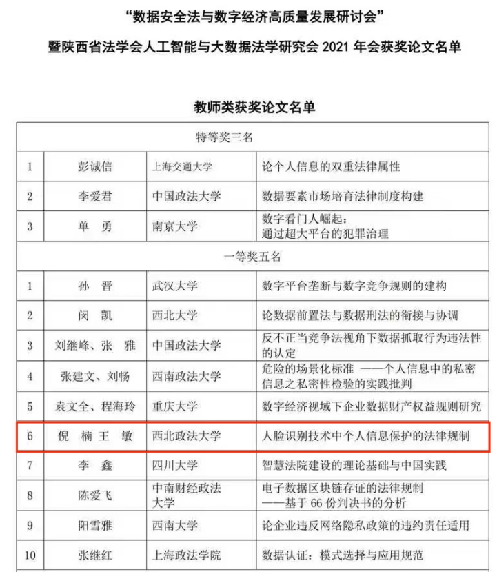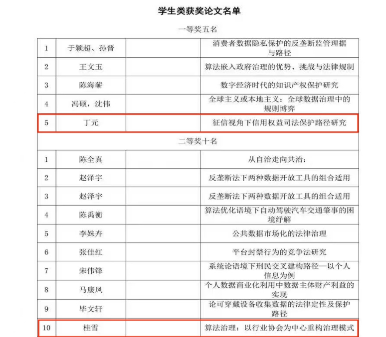 新葡的京倪楠教授、王敏同学所投稿《人脸识别中个人信息保护的法律规制》获得教师组一等奖;研究生丁元同学所投稿《征信视角下信用权益司法保护路径研究》获得学生组一等奖;研究生桂雪同学所投稿《算法治理:以行业协会为中心重构治理模式》获得学生组二等奖。