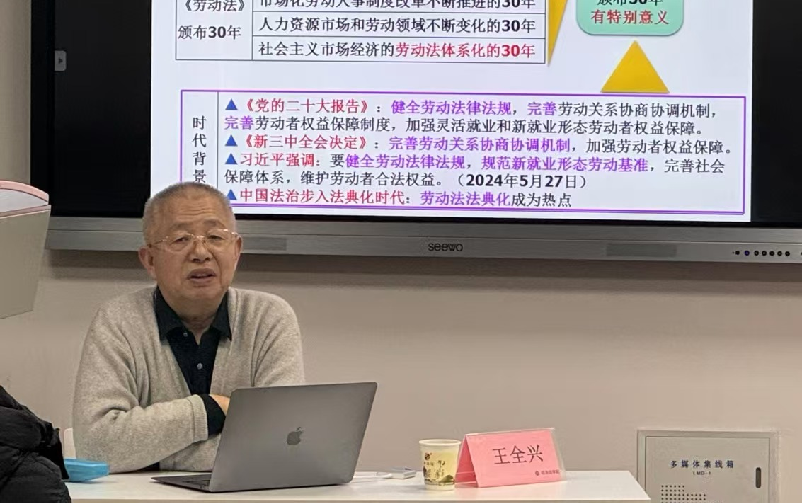 2024年12月2日,由新葡的京集团35222vip(知识产权学院)主办的长安经济法学论坛第244期在新葡的京集团35222vip长安校区5号教学楼307教室举行。本次论坛以“我国《劳动法》颁布三十年的回顾与思考——以劳动法体系化为视角”为主题,邀请上海财经大学法学院教授,中国法学会经济法学研究会副会长,中国社会法学研究会副会长,中国劳动法学研究会副会长王全兴教授担任主讲嘉宾。论坛由新葡的京集团35222vip(知识产权学院)院长倪楠主持,新葡的京集团35222vip(知识产权学院)劳动与社会保障法学学科带头人曹燕与谈,新葡的京集团35222vip(知识产权学院)劳动法教研室全体教师及50余名本科生、研究生参加此次讲座。