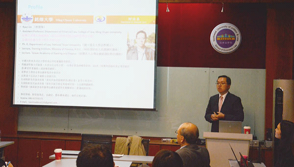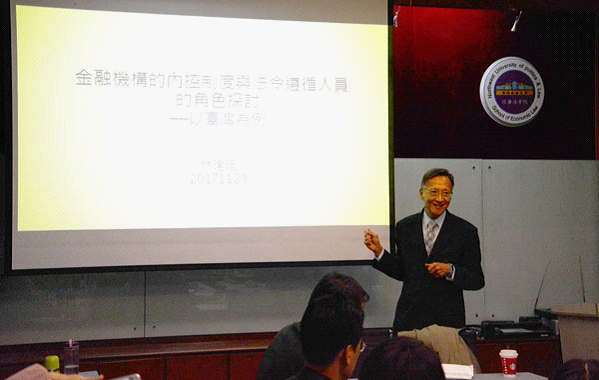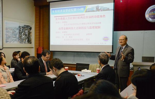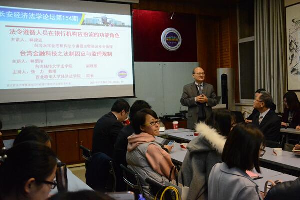 2017年11月30日晚,《长安经济法学论坛一百五十四期》在新葡的京集团35222vip雁塔校区行政楼三楼新葡的京集团35222vip资料室举行。本次论坛邀请台湾永丰金控总机构法令遵循主管资深专业协理林建廷先生主讲《法令遵循人员在银行机构应扮演的功能角色——以台湾为例》、台湾铭传大学法学院林盟翔副教授主讲《台湾金融科技之法治因应与监理规制》。新葡的京集团35222vip傅瑜副教授、王莹莹副教授以及新葡的京研究生共计50余人参加本次论坛。论坛由新葡的京集团35222vip院长强力教授主持。