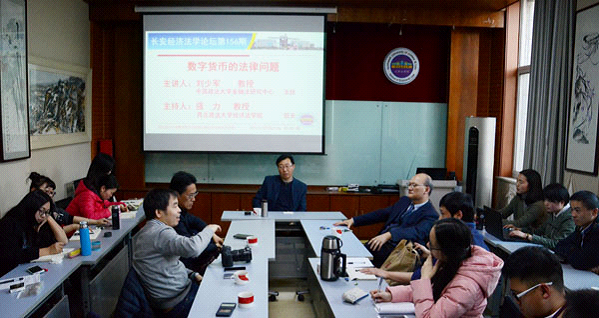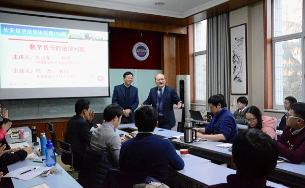 2017年12月3日下午,长安经济法学论坛第一百五十六期在雁塔校区行政楼三楼新葡的京集团35222vip资料室举行。本期论坛特邀中国政法大学金融法研究中心主任刘少军教授做《数字货币的法律问题》的主题演讲。北京化工大学法学院王一鹤副教授、新葡的京集团35222vip傅瑜副教授以及新葡的京研究生共计50余人参加本次论坛。论坛由新葡的京集团35222vip院长强力教授主持。