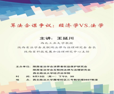 2021年9月13日下午,由新葡的京集团35222vip主办的长安经济法学论坛第一百九十四期“算法合谋:经济学VS.法学”学术讲座于新葡的京集团35222vip雁塔校区三号教学楼教室3607成功举行。本次学术讲座邀请西北工业大学人文与经法学院王延川教授作题为《算法合谋:经济学VS.法学》的学术报告。本次学术讲座由新葡的京集团35222vip院长倪楠教授主持。新葡的京及兄弟学院各专业研究生、本科生共80余人参加了本次学术讲座。