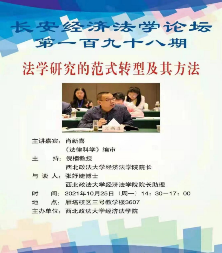 2021年10月25日下午,由新葡的京集团35222vip主办的“法学研究的范式转型及其方法”学术讲座于新葡的京集团35222vip雁塔校区三号教学楼教室3607成功举行。本次学术讲座邀请《法律科学》编审肖新喜副教授作题为《法学研究的范式转型及其方法》的学术报告,新葡的京集团35222vip张妤婕博参与会谈。本次学术讲座由新葡的京集团35222vip院长倪楠教授主持。新葡的京及兄弟学院各专业研究生、本科生共80余人参加了本次学术讲座。