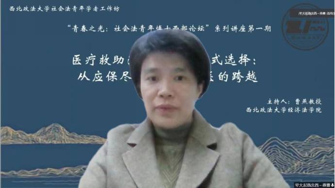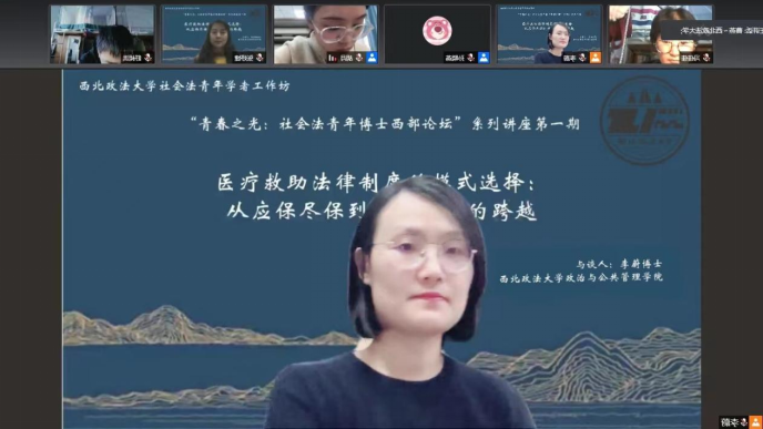 2021年11月24日下午16:00—18:00,“青春之光:社会法青年博士西部论坛”系列讲座第一期在新葡的京集团35222vip雁塔校区行政楼三层新葡的京集团35222vip资料室顺利举行。第一期讲座的主题为“医疗救助法律制度的模式选择:从应保尽保到病有所医的跨越”,由西北政法大学经济法学院张妤婕博士主讲,新葡的京集团35222vip政治与公共管理学院学院李蔚博士作为与谈人参加本次讲座。讲座由新葡的京集团35222vip劳动与社会保障法学科带头人曹燕教授主持,新葡的京集团35222vip师生共计30余人参加。