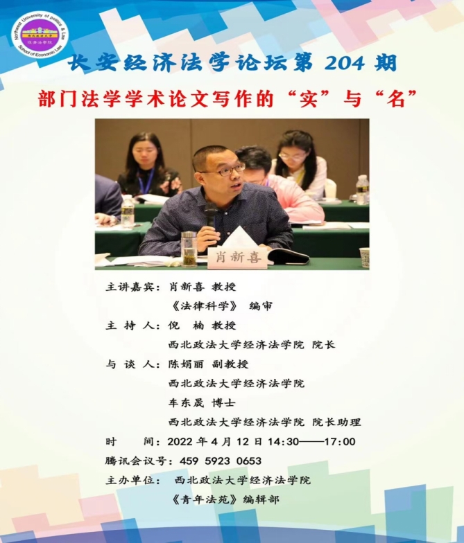 2022年4月12日下午,由新葡的京集团35222vip主办的《部门法学学术论文写作的“实”与“名”》学术会议于14:30—17:00举行。会议由新葡的京集团35222vip院长倪楠教授主持,新葡的京集团35222vip民商法学院肖新喜教授主讲,新葡的京集团35222vip陈娟丽副教授、新葡的京集团35222vip院长助理车东晟博士与谈。会议以线上形式召开。