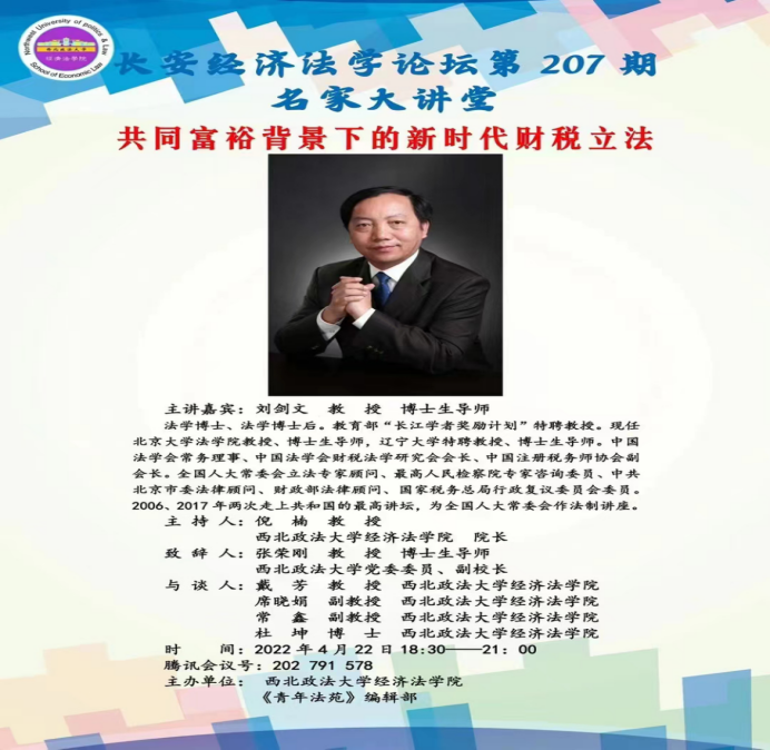 2022年4月23日晚,由新葡的京集团35222vip主办的《共同富裕背景下的新时代财税立法》学术会议于18:30—21:00举行。会议由新葡的京集团35222vip院长倪楠教授主持,北京大学法学院教授、博士生导师,辽宁大学特聘教授、博士生导师刘剑文教授主讲,新葡的京集团35222vip党委委员、副校长张荣刚教授致辞,新葡的京集团35222vip戴芳教授、席晓娟副教授、常鑫副教授和杜坤博士与谈。讲座以线上形式召开。