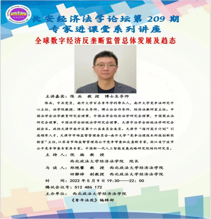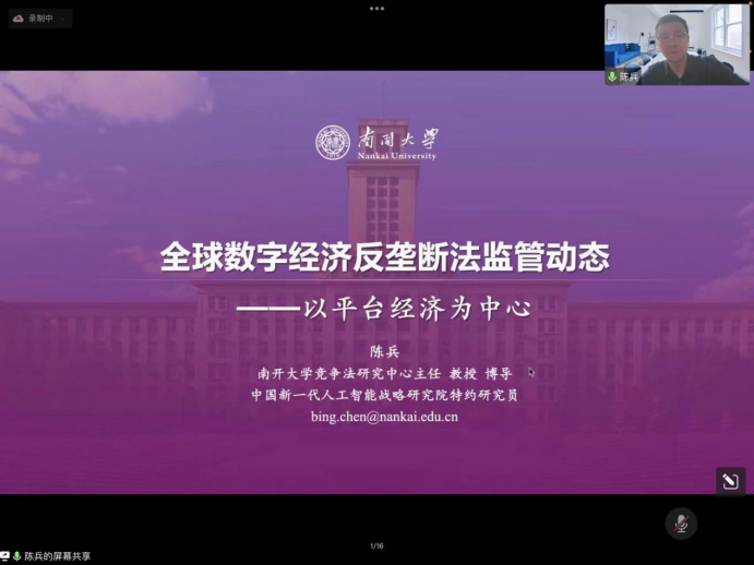 2022年5月9晚,由新葡的京集团35222vip主办的《全球数字经济反垄断法监管动态——以平台经济为中心》学术会议于19:30—22:00举行。会议由新葡的京集团35222vip院长倪楠教授主持,南开大学百名青年学科带头人、南开大学竞争法研究中心主任、法学院教授、博士生导师、博士后合作导师、经济法教研室主任陈兵教授主讲,新葡的京集团35222vip郑艳馨教授、田静婷副教授与谈。会议以线上形式召开。