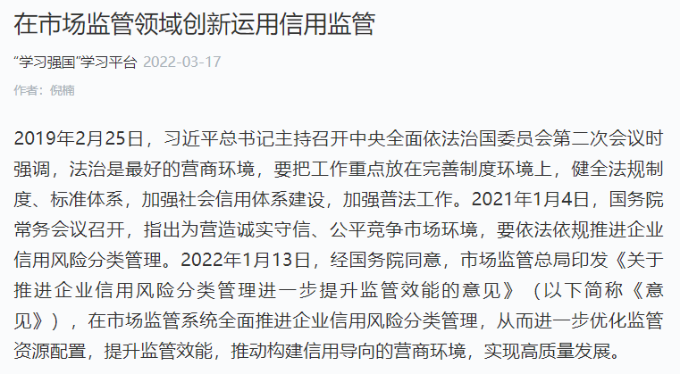2019年2月25日,习近平总书记主持召开中央全面依法治国委员会第二次会议时强调,法治是最好的营商环境,要把工作重点放在完善制度环境上,健全法规制度、标准体系,加强社会信用体系建设,加强普法工作。2021年1月4日,国务院常务会议召开,指出为营造诚实守信、公平竞争市场环境,要依法依规推进企业信用风险分类管理。2022年1月13日,经国务院同意,市场监管总局印发《关于推进企业信用风险分类管理进一步提升监管效能的意见》(以下简称《意见》),在市场监管系统全面推进企业信用风险分类管理,从而进一步优化监管资源配置,提升监管效能,推动构建信用导向的营商环境,实现高质量发展。