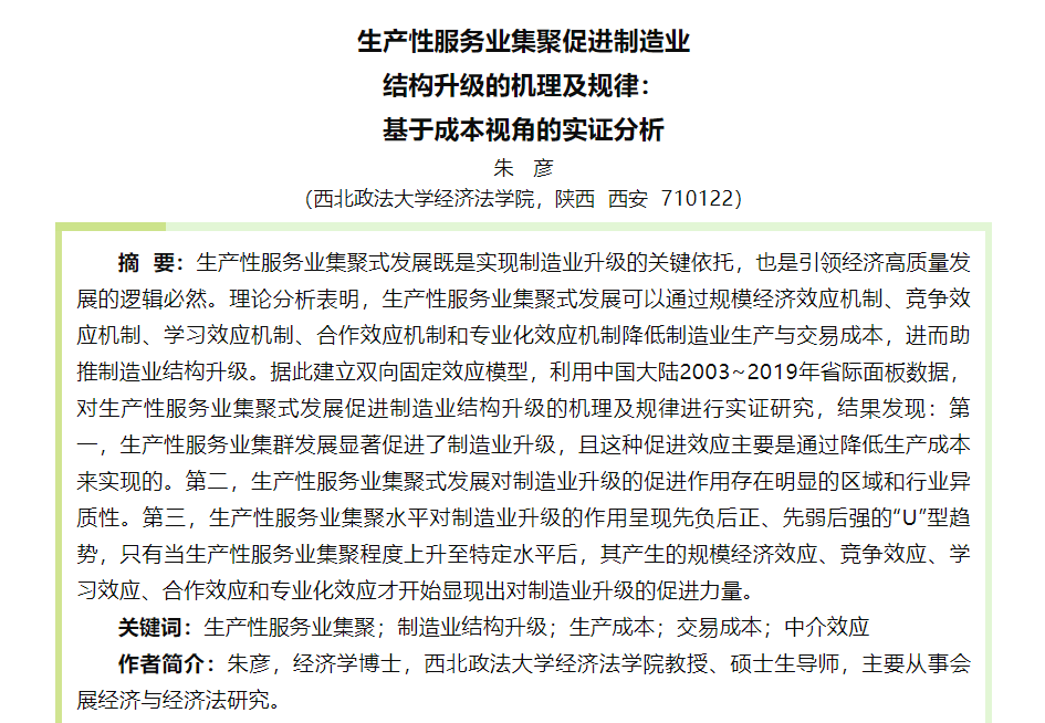 【深圳大学学报(人文社会科学版)】朱彦:生产性服务业集聚促进制造业 结构升级的机理及规律: 基于成本视角的实证分析