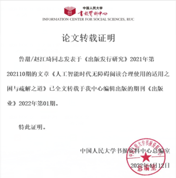 近日,从中国人民大学复印报刊资料数据库获悉,新葡的京集团35222vip(知识产权学院)教师鲁甜博士(一作)的论文《人工智能时代无障碍阅读合理使用的适用之困与疏解之道》被中国人民大学书报资料中心复印报刊资料《出版业》2022年第01期全文转载。该论文原发表于《出版发行研究》2022年第10期。